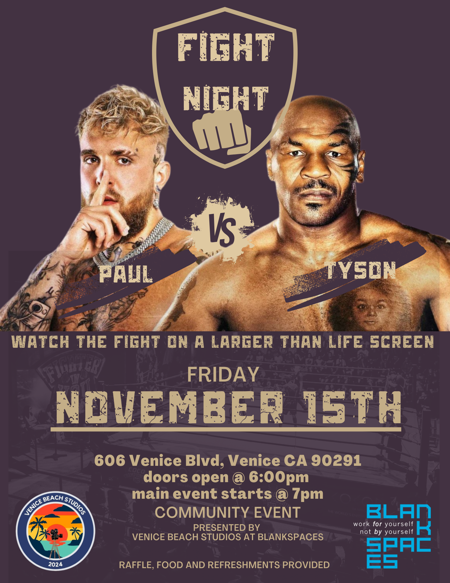 Back to All Events Paul v. Tyson Watch Party Friday, November 15, 2024 5:00 PM 9:00 PM BLANKSPACES Venice 606 Venice Boulevard Los Angeles, CA, 90291 United States (map) Google Calendar ICS Join us on Fri Nov 15, 2024 at 6:00 PM at BLANKSPACES Venice to watch two legends go head-to-head with drinks, food and prizes. Don't miss out on this exciting event - grab your friends and come cheer on your favorite fighter! See you there!