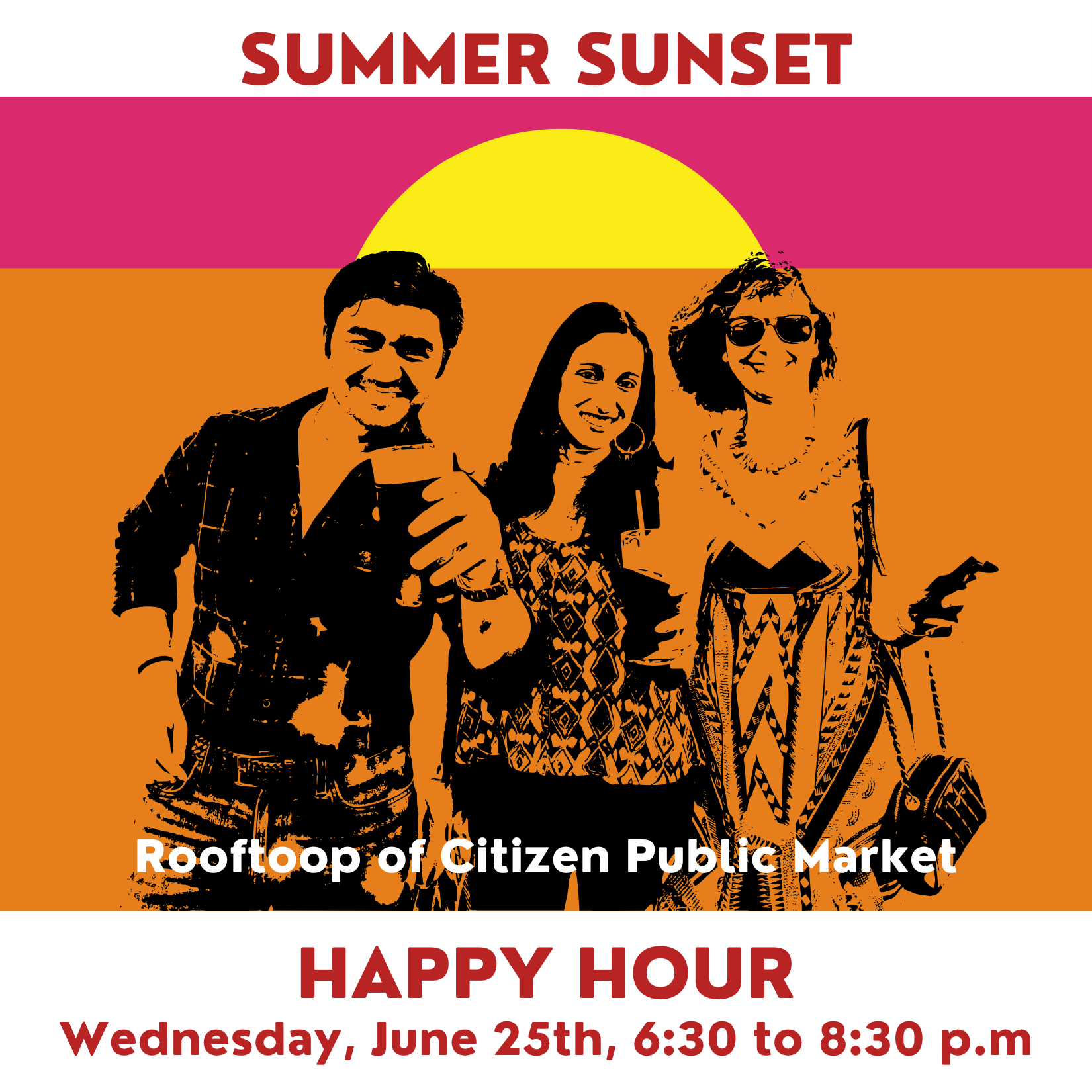 Join us on the rooftop of Citizen Public Market on Wednesday, June 25th, from 6:30 to 8:30 p.m. for drinks, food from one of the many vendors, and great company!