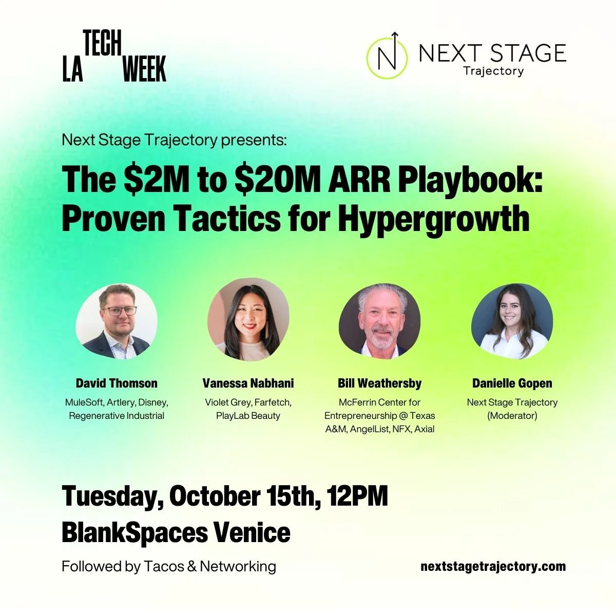 Come see us at LATechWeek where we’ll be hosting a panel with these amazing serial founders David Thomson, Vanessa Nabhani, Bill Weathersby and hosted by Next Stage Trajectory’s Danielle Gopen. Join us we talk about the journey of scaling a company from $2M to $20M+ in annual revenue. Hint: there are 6 steps that will get you there.