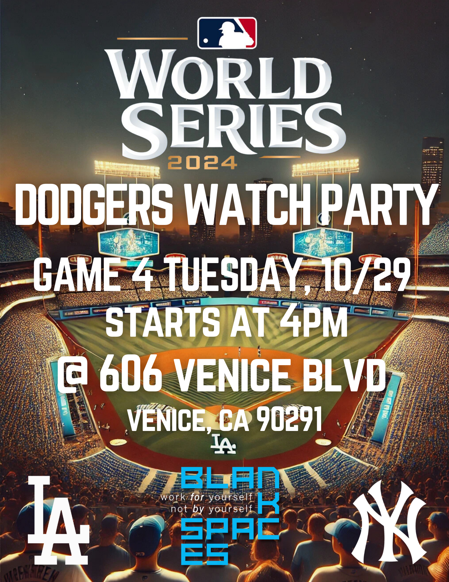 World Series Watch Party - Game 4 Tuesday, October 29, 2024 4:00 PM Wednesday, October 30, 2024 8:00 PM BLANKSPACES Venice 606 Venice Boulevard Los Angeles, CA, 90291 United States (map) Google Calendar ICS Join fellow Dodger fans to watch Game 4 of the 2024 World Series! The game will be showcased in our large auditorium on our 36' LED jumbotron screen! Please RSVP at the link below.